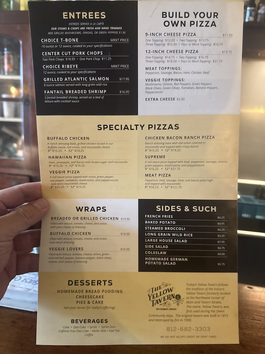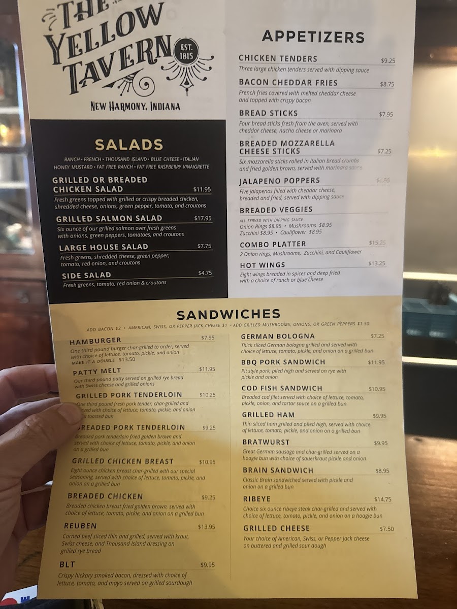The menu at Yellow Tavern offers a pleasant mix of classic American dishes served in a casual, welcoming setting. You’ll find a selection that combines comforting, familiar options with hearty sandwiches, fresh salads, and shareable pizzas. Perfect for a relaxed lunch, dinner with friends, or a simple, satisfying meal after exploring New Harmony.